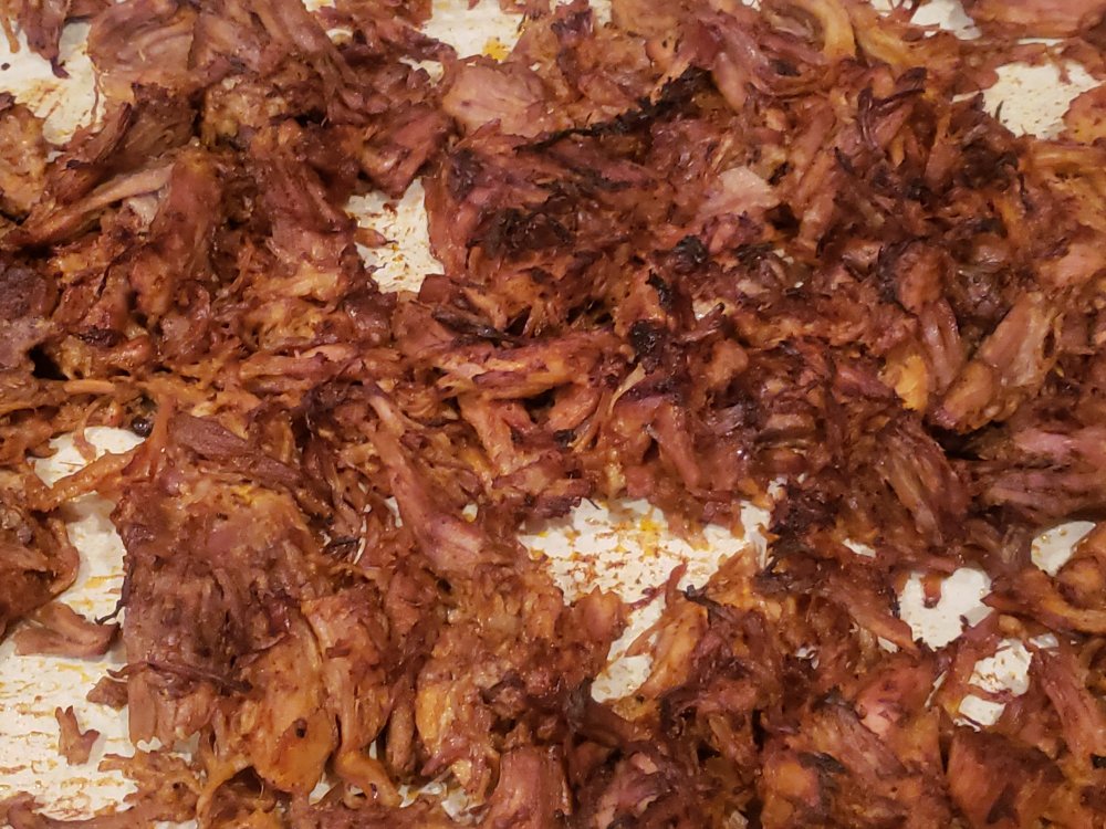 - This step is completely optional, but I like my pulled pork to be a little crispy, so I spread it on a baking sheet and put it under the broiler for about 10 minutes, but would frequently check on it as ovens can vary.