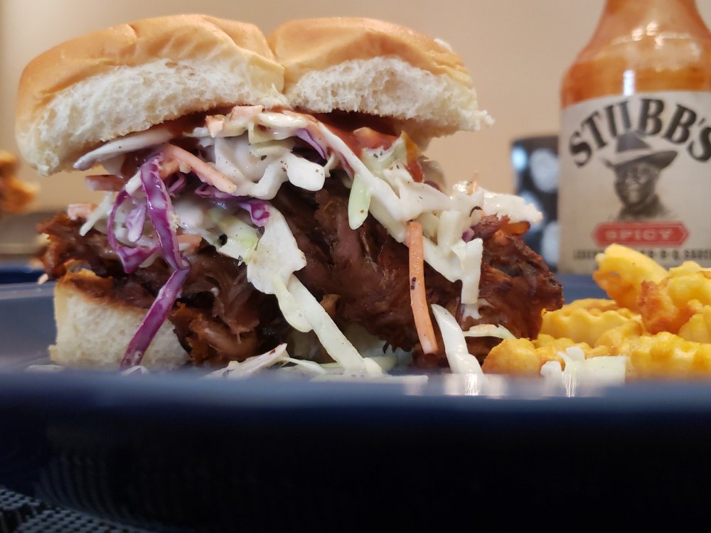- Pull the pork out of the oven and place on you favorite rolls, top with some coleslaw and additional barbecue sauce.