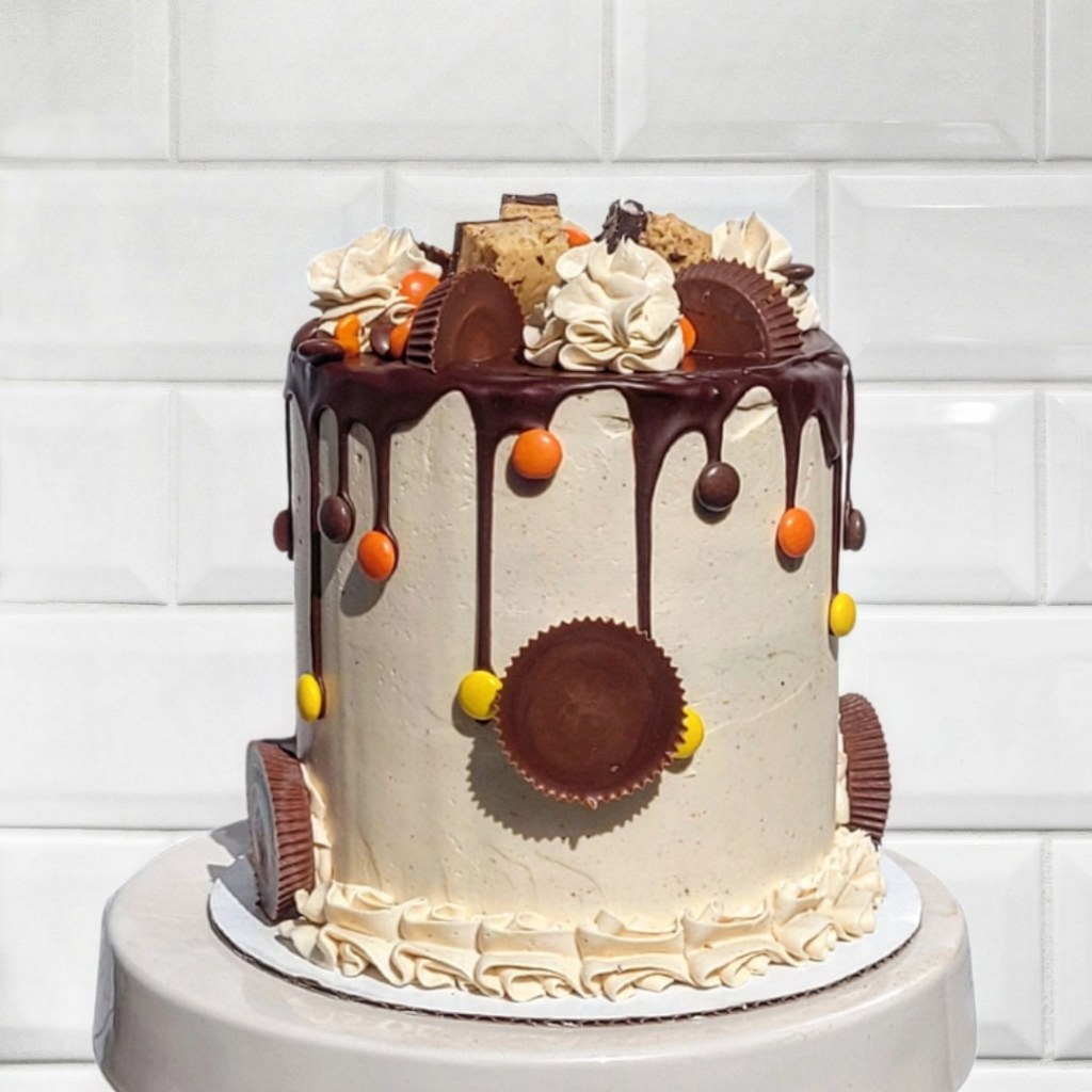 Reese’s Peanut Butter Cake – three 8″ layers of chocolate cake filled with peanut butter buttercream and Reese’s Peanut Butter cups and Reese’s pieces. Covered in a chocolate ganache, and topped with more peanut butter buttercream and Reese’s peanut butter cups, decorated with Reese’s pieces. This can also be made into Cupcakes